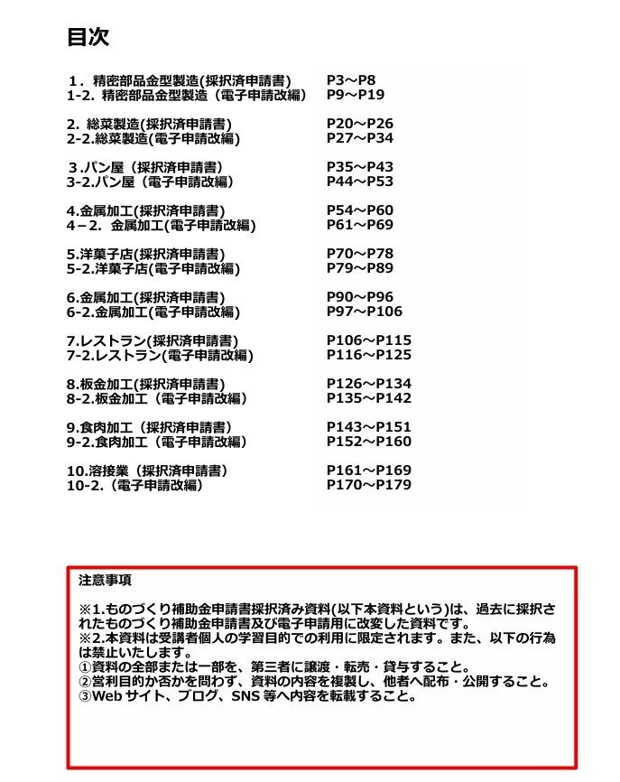 内容 精密部品金型製造・総菜製造・パン屋・金属加工その1・洋菓子店・金属加工その2・レストラン・板金加工・食肉加工・溶接業の10事例です。採択された申請書とそれを電子申請用に改編した資料です。